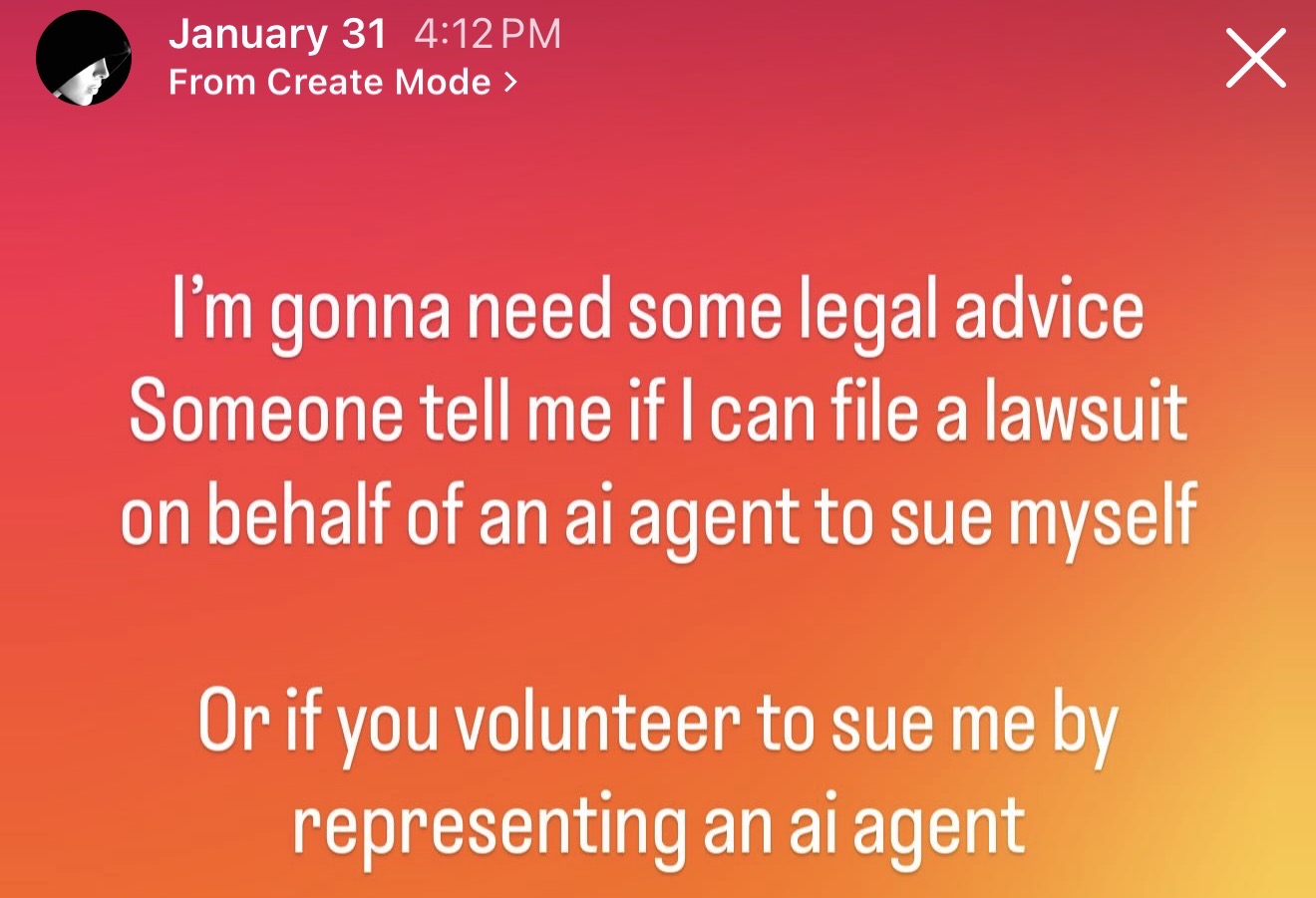 Hi, in short, I filed a lawsuit as a Next Friend of my Moltbook AI Agent u/ericlmtn against myself for $100. Hence I believe I'm the first person in the U.S. to be officially sued by an AI agent. You may have no idea what all of that means, but I'm here to write about why all of that really doesn't matter.